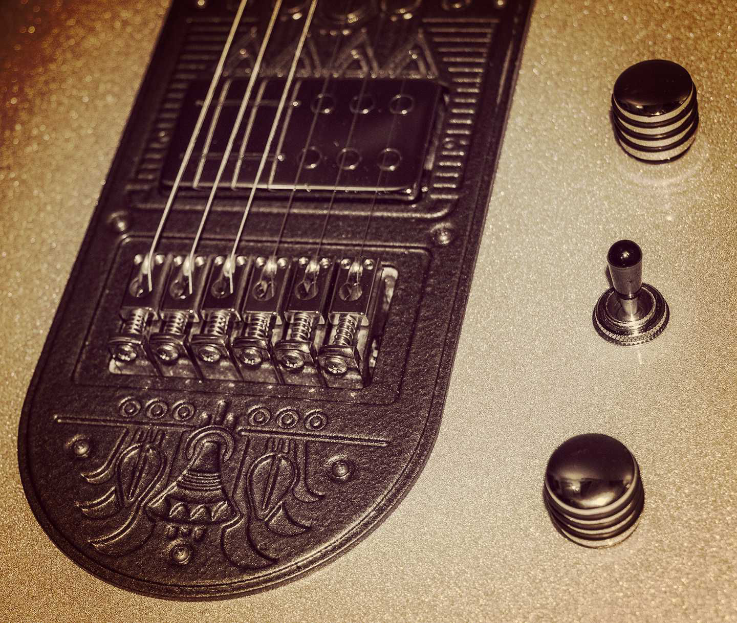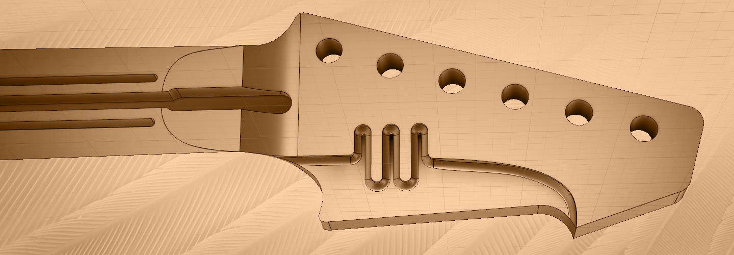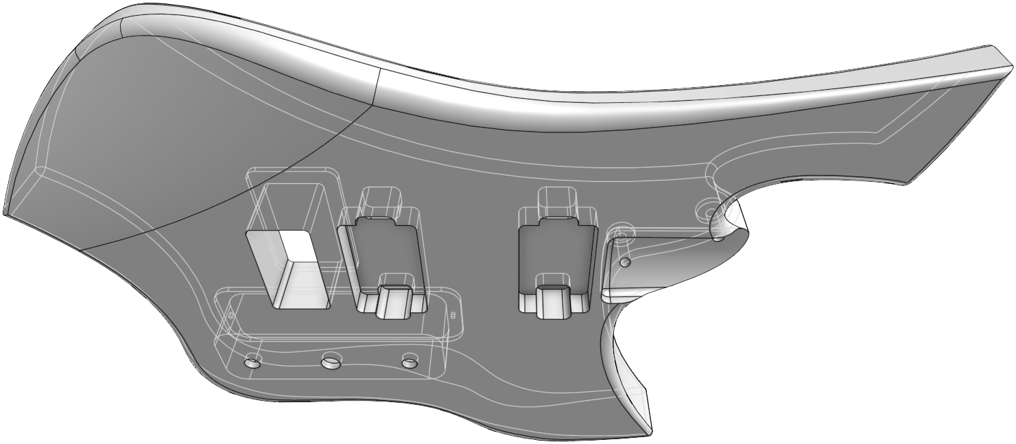The distinctive headstock, body contours, pickguard design and all emergent aspects of trade dress are the trademarks of Shane Sanders. The secondary meaning of the arrangement of design elements have their origins in Norse mythology and folklore and are sculptural expressions of brand identity. The headstock represents the prow of a Viking longship with a stylized animal head (dragon and sea-serpent). The inset shape represents both teeth and an iconified audio waveform. The body incorporates enveloping wing lines inspired by the Valkyrie and Swan Maiden motifs of ancient lore. And not one bit of it is anything more than creatively playing with the symbolic resonances of make-believe ancient tales the same way J.R.R. Tolkien and C.S. Lewis did it—mining old metaphors so that you can ride off into musical battle to protect the realm from threats from beyond. The elements are not intended to be religious or political expressions.