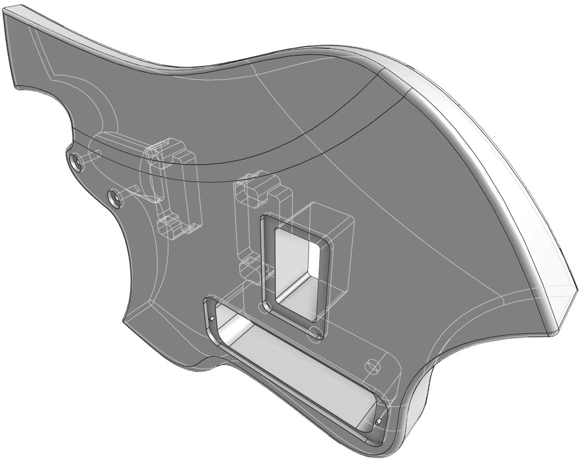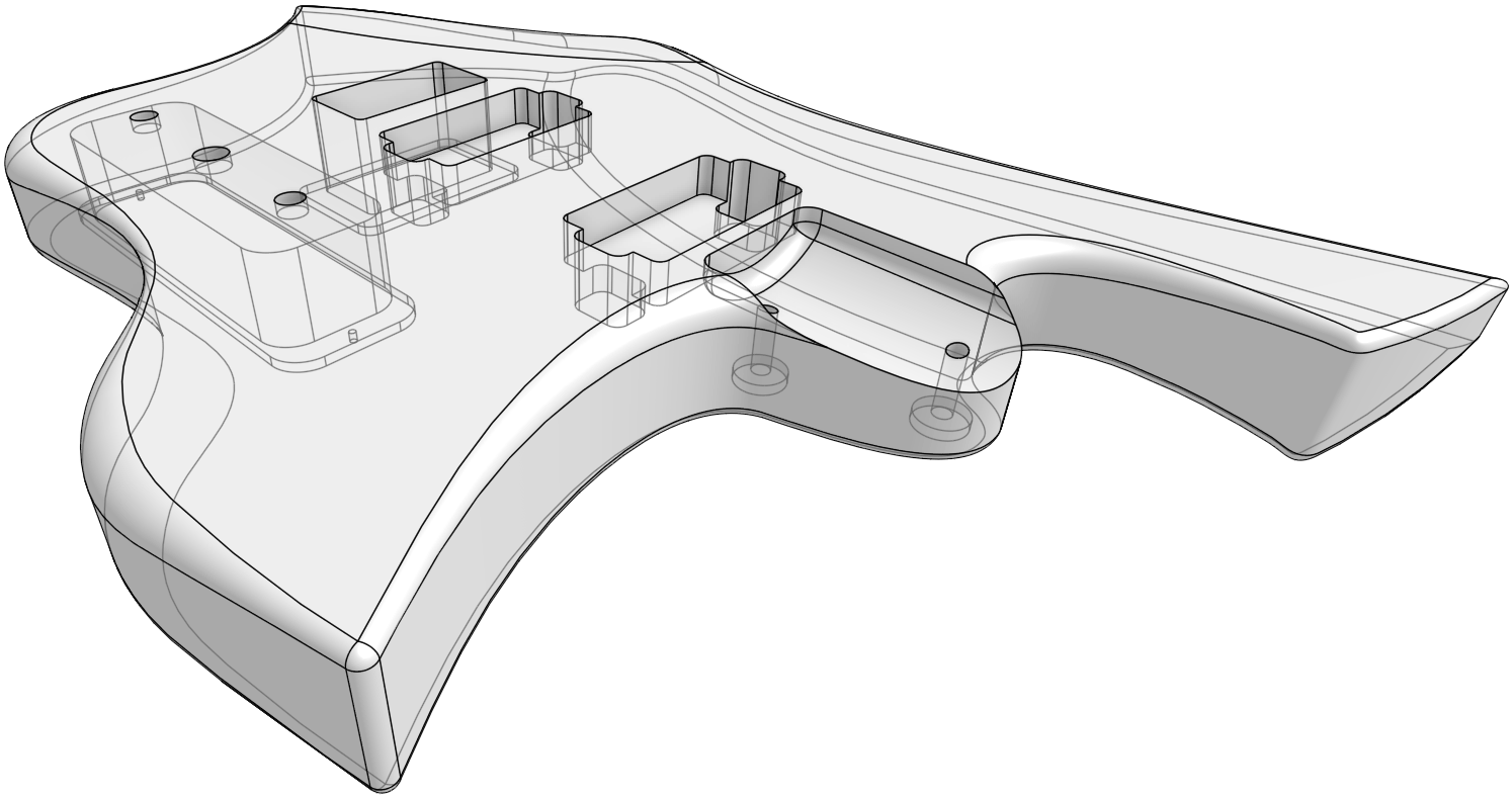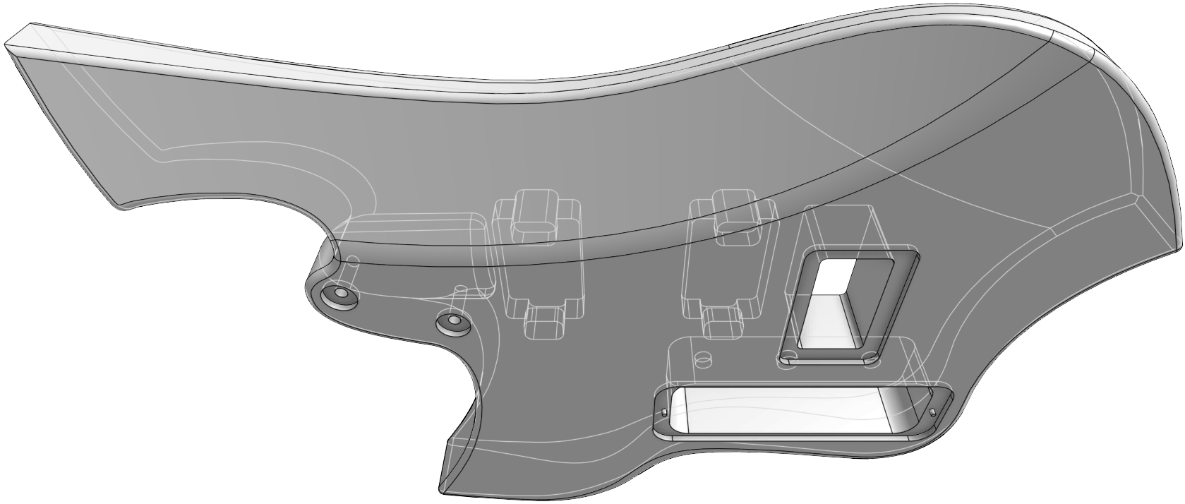 The distinctive headstock, body contours, pickguard design and all emergent aspects of trade dress are the trademarks of Shane Sanders. The secondary meaning of the arrangement of design elements have their origins in Norse mythology and folklore and are sculptural expressions of brand identity. The headstock represents the prow of a Viking longship with a stylized animal head (dragon and sea-serpent). The inset shape represents both teeth and an iconified audio waveform. The body incorporates enveloping wing lines inspired by the Valkyrie and Swan Maiden motifs of ancient lore. And not one bit of it is anything more than creatively playing with the symbolic resonances of make-believe ancient tales the same way J.R.R. Tolkien and C.S. Lewis did it—mining old metaphors so that you can ride off into musical battle to protect the realm from threats from beyond. The elements are not intended to be religious or political expressions.